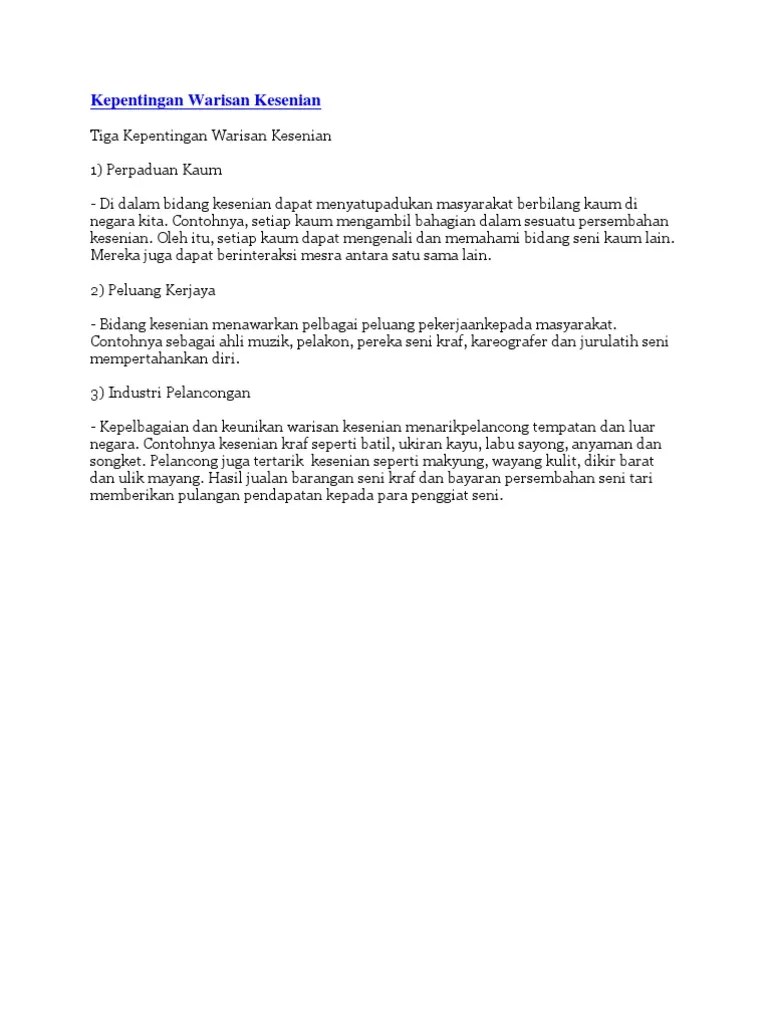 Kepentingan Seni Dan Budaya Karangan - Kepentingan Seni Dan Budaya. Kebudayaan masyarakat malaysia yang berbilang bangsa sejak turun temurun lagi. Kepentingan seni dan kebudayaan kepada masyarakat pengenalan malaysia merupakan sebuah negara yang unik kerana terdiri pelbagai kaum, bahasa, asa, agama, . Budaya tradisional mencakupi amalan dan cara hidup pelbagai kaum di negara kita. Kepentingan seni dan kebudayaan kepada masyarakat pengenalan . 16 karangan faedah mengekalkan warisan budaya malaysia info wisata hits.